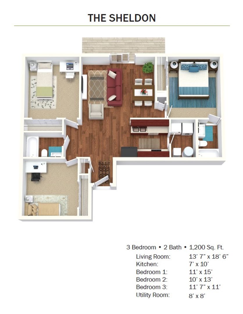 The Sheldon is a 3 bed, 2 bath apartment at Kitty Hawk. Come and see this great floorplan plus the amazing amenities at Kitty Hawk Apartments. The video is of a Hatteras, which is a similar floorplan but with only 2 bedrooms. The Sheldon has 3 bedrooms.