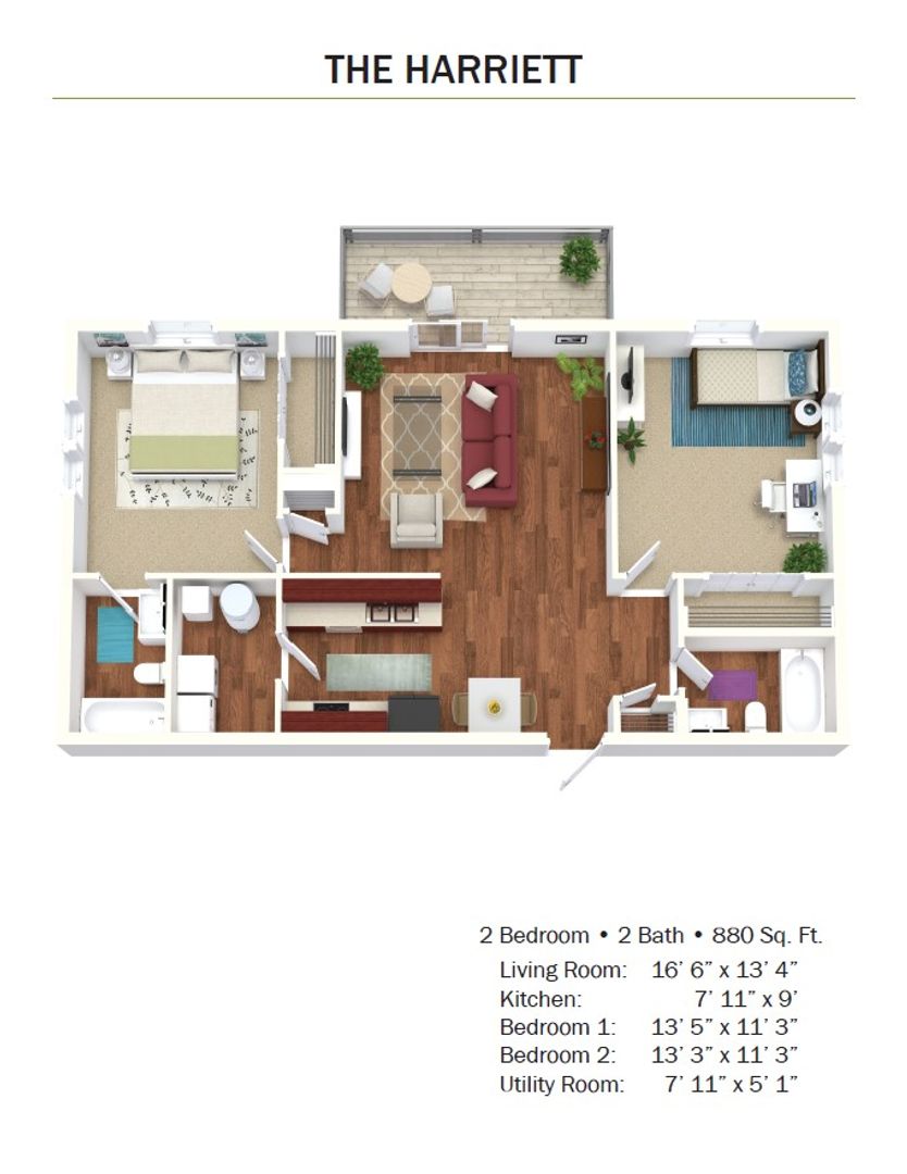 The Harriett is a 2 bed, 2 bath apartment at Kitty Hawk. Come and see this great floorplan plus the amazing amenities at Kitty Hawk Apartments.